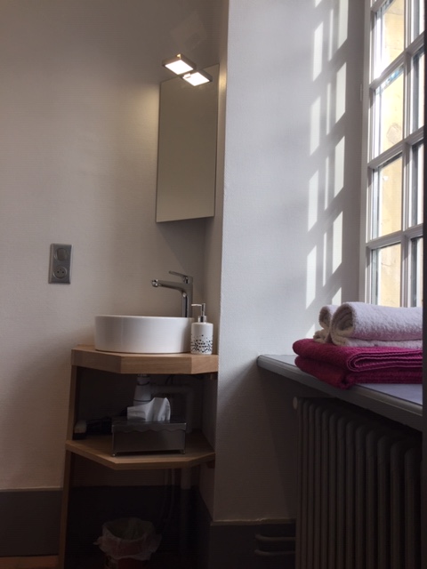 Das Sonnenlicht dringt auch großzügig in das separate Badezimmer ein (Dusche, Waschbecken, WC). Dank eines Fensters und eines Spiegels welche sich das Licht gegenseitig bis zum Nachteinbruch spiegeln.