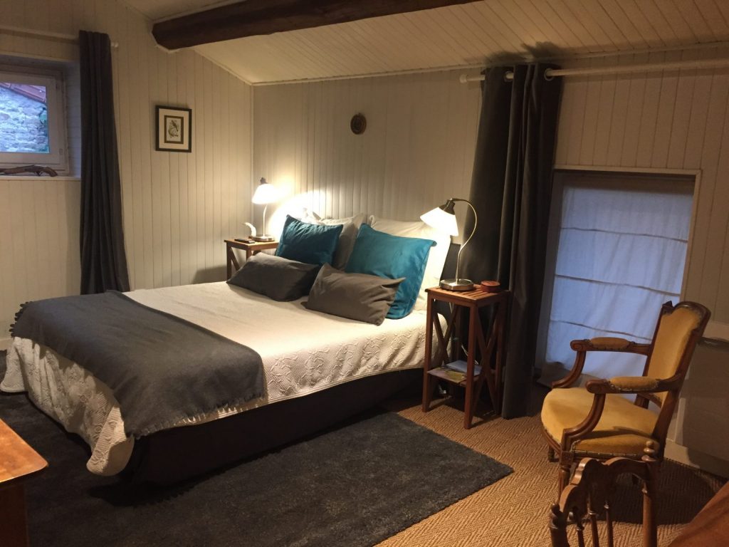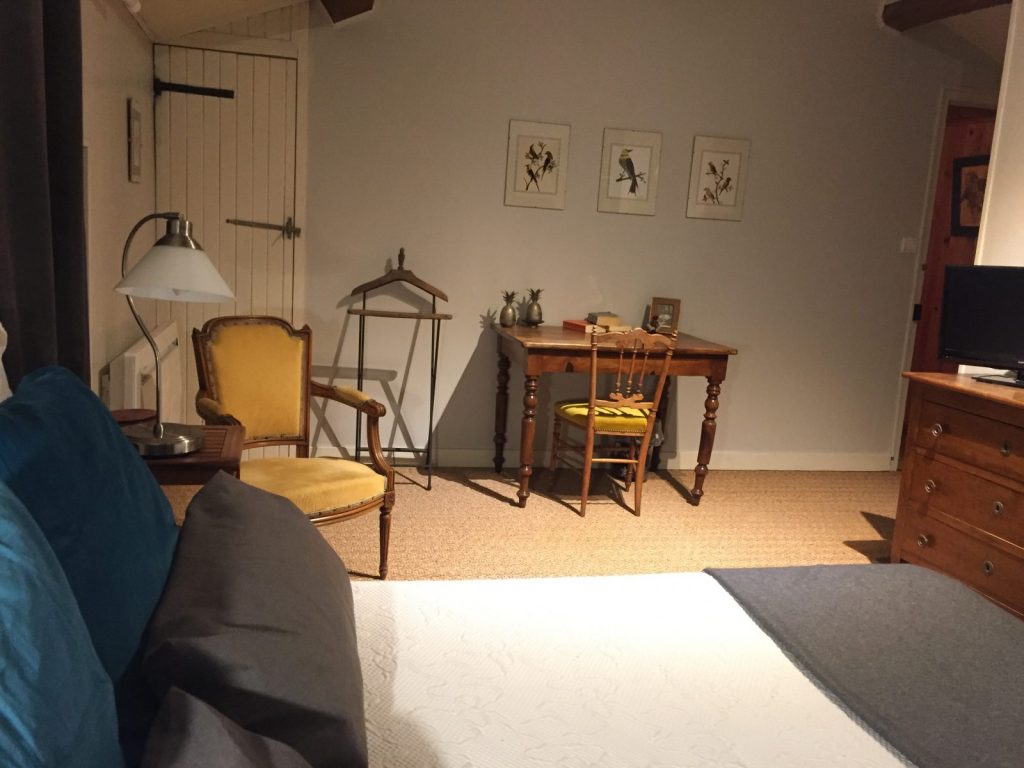 Ein breites Bett (160×200) zwischen zwei eleganten Nachtkästchen und Ihren Lampen, ein Bürotisch und eine Kommode mit drei Schubladen und Ihren Messingknöpfen, zwei Lehnstühle zum Träumen von alten Zeiten und großer Weite, das ist die Atmosphäre von Onkel Bobs Zimmer.